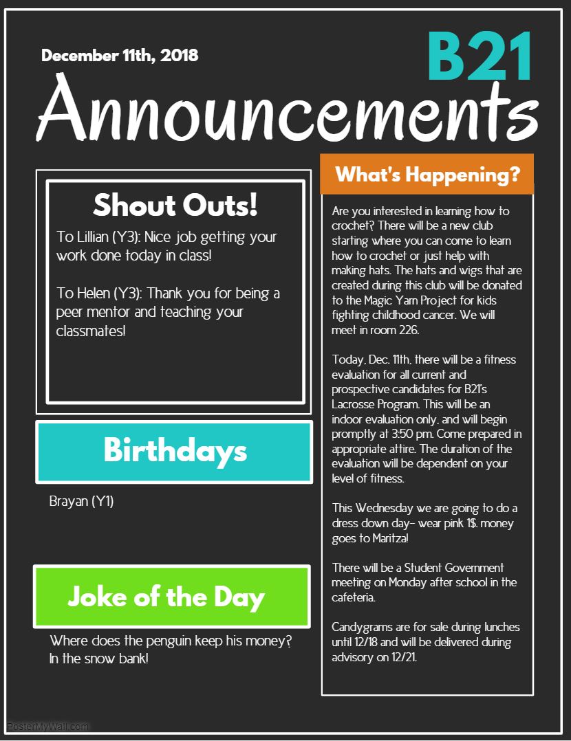 Announcements- 12/11 Posted by Melissa Routson on Tuesday, December 11, 2018 at 8:40 am December 11th Comments No comments have been posted yet. Log in to post a comment.