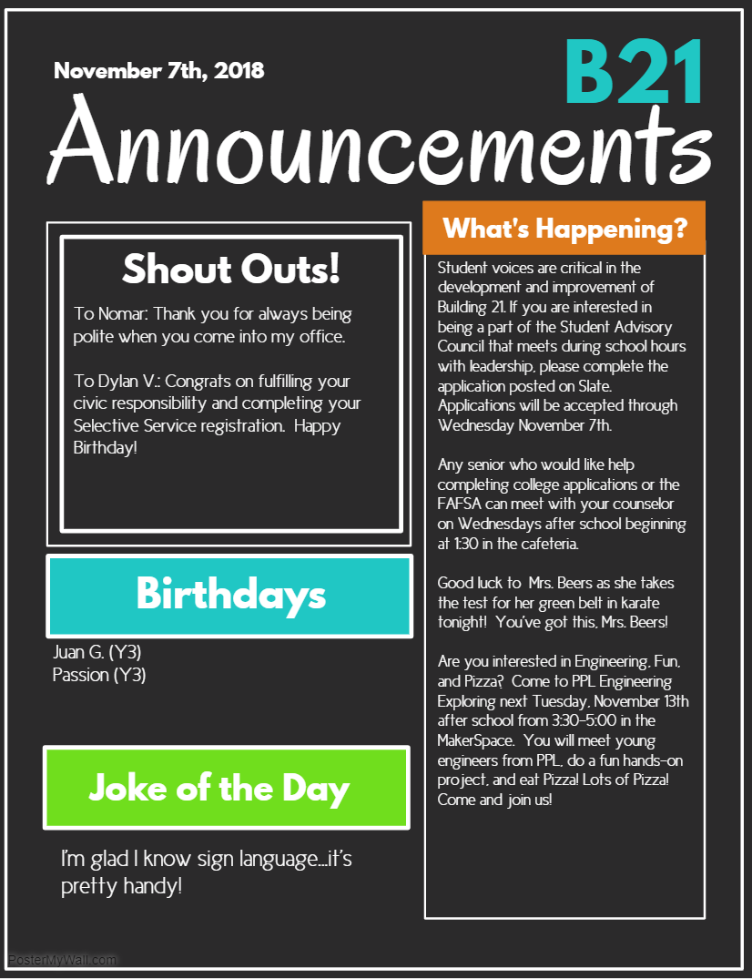 Announcements- 11/7 Posted by Melissa Routson on Wednesday, November 7, 2018 at 8:40 am November 7th Comments No comments have been posted yet. Log in to post a comment.