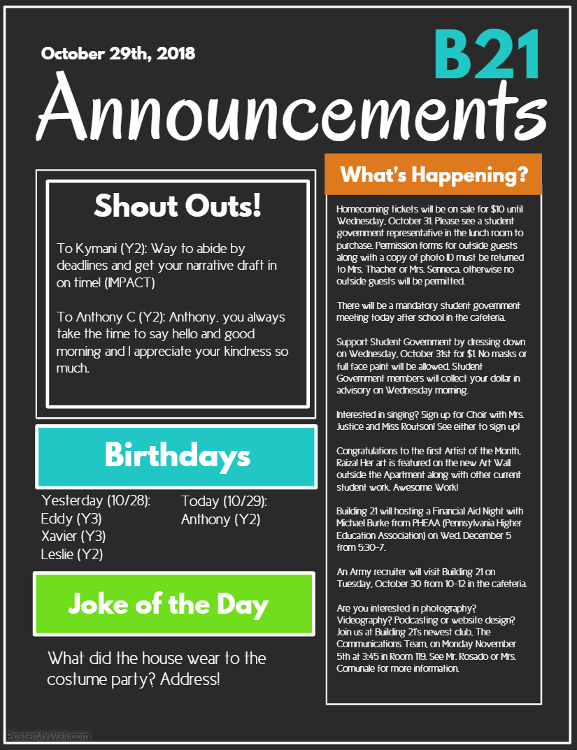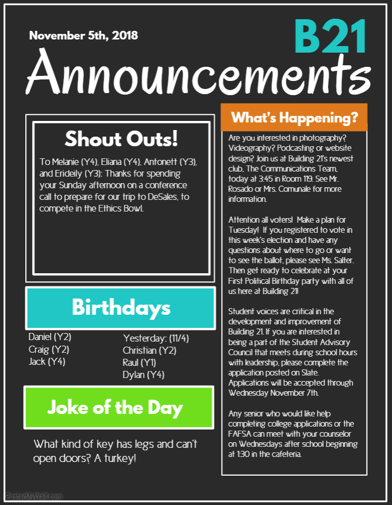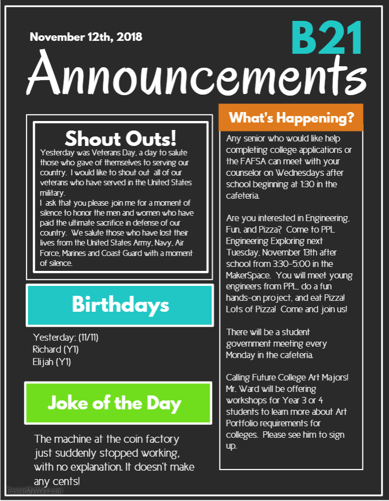 Announcements- Monday 11/13