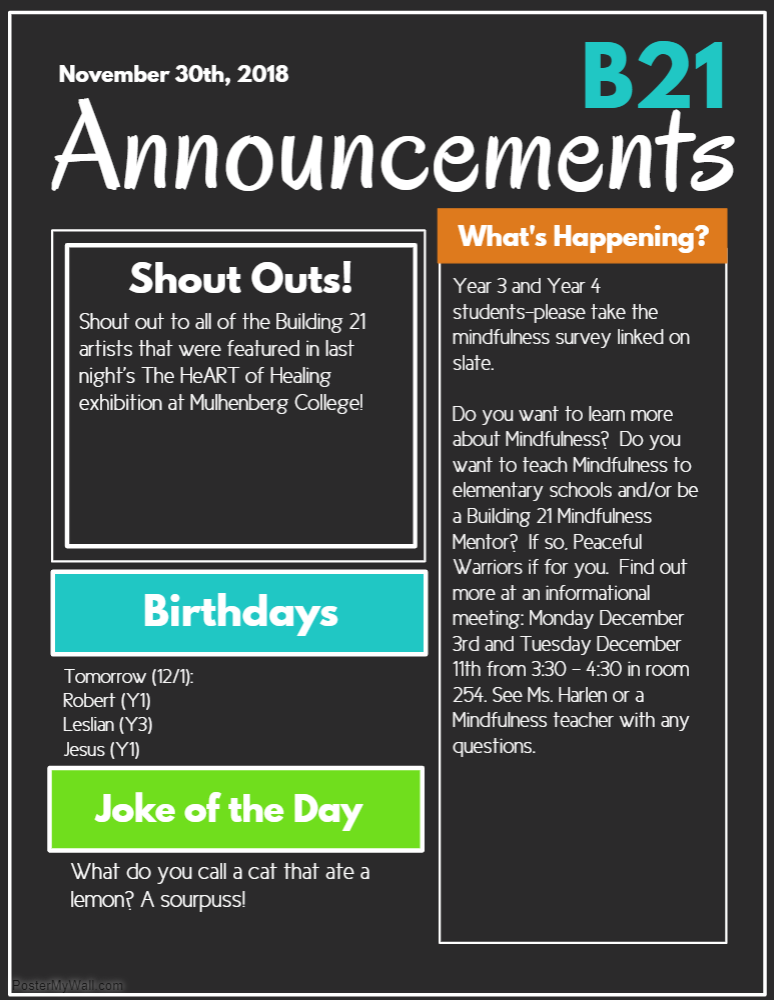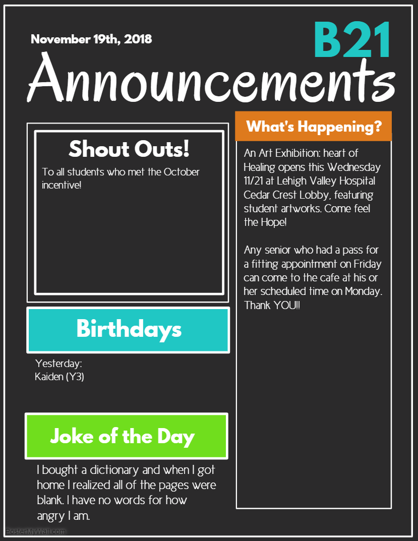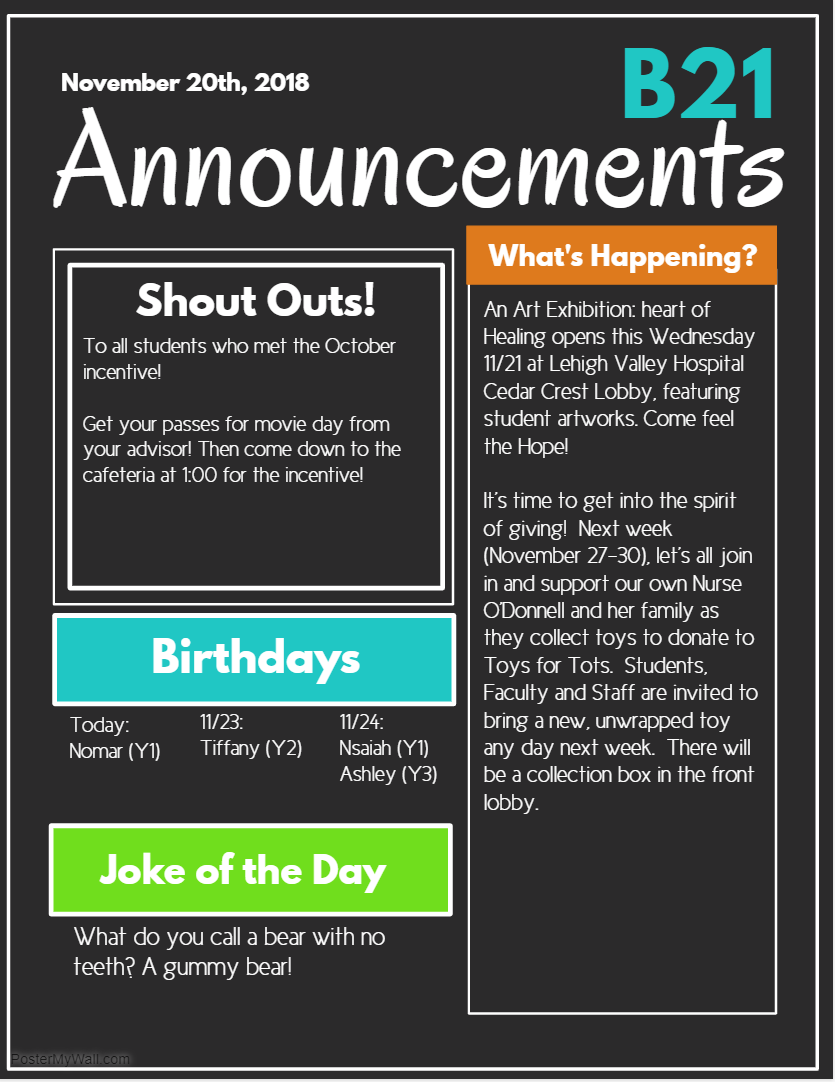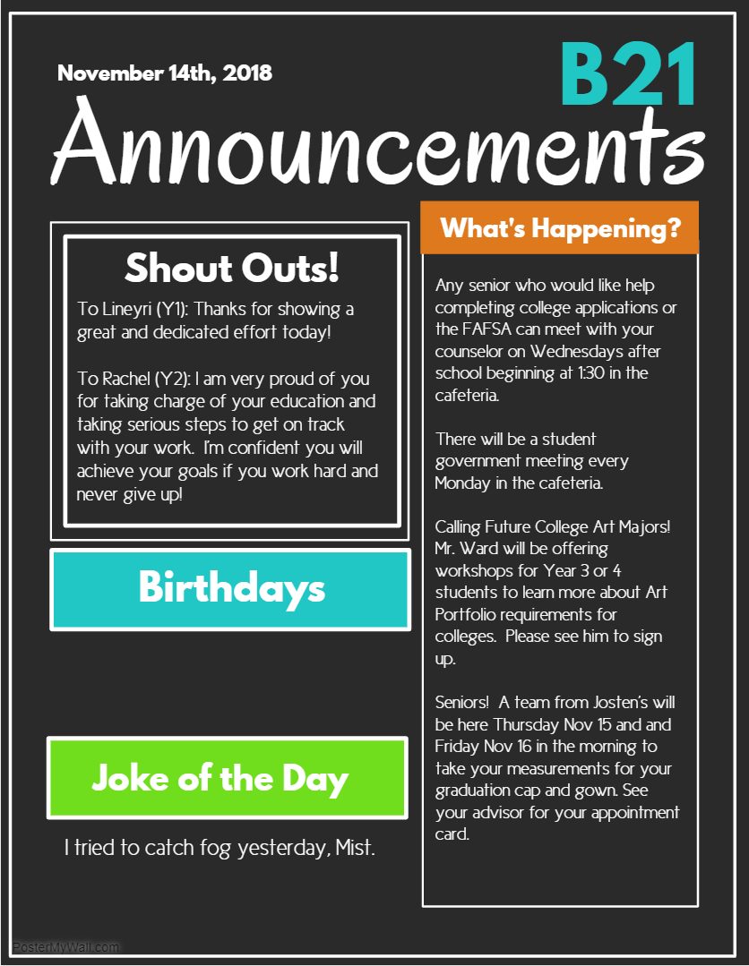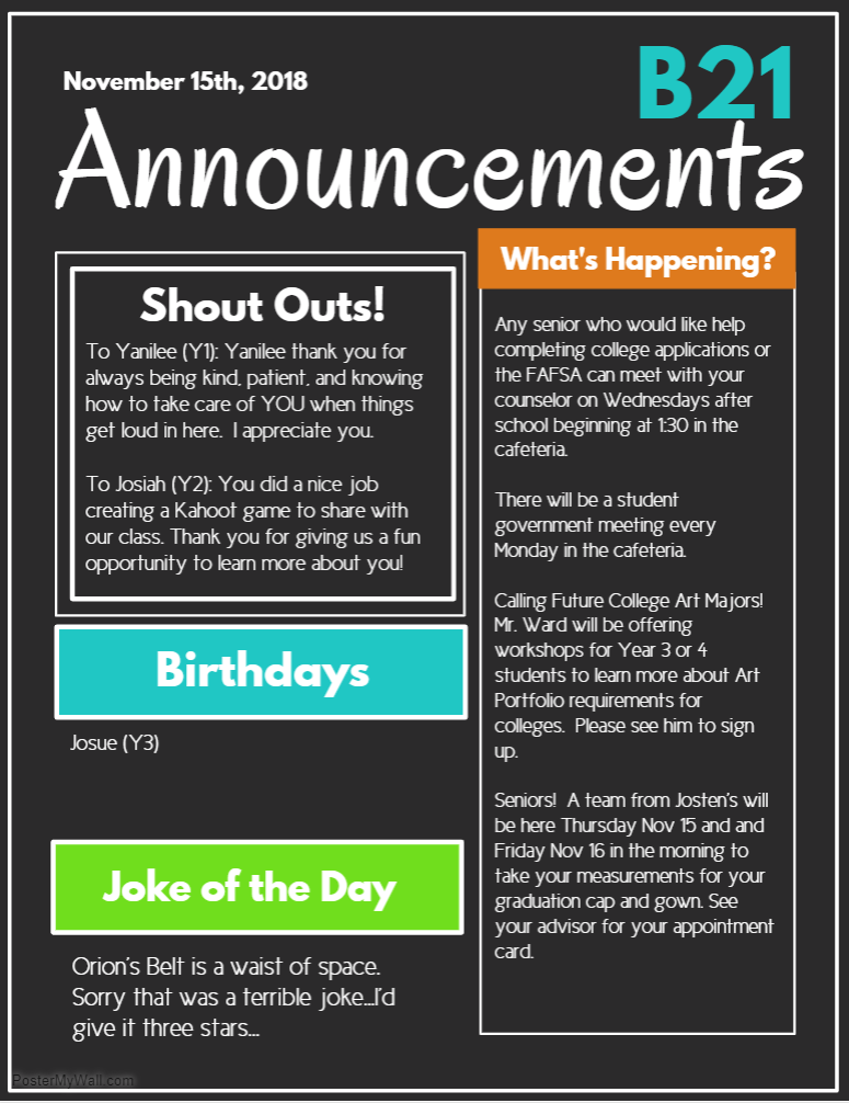 Announcements- Wednesday 11/15